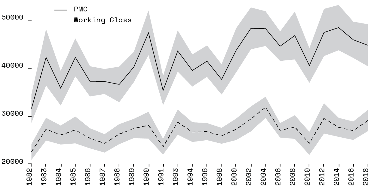 Average Working-Class and pmc Incomes, 1982–2018 (in thousands of USD)