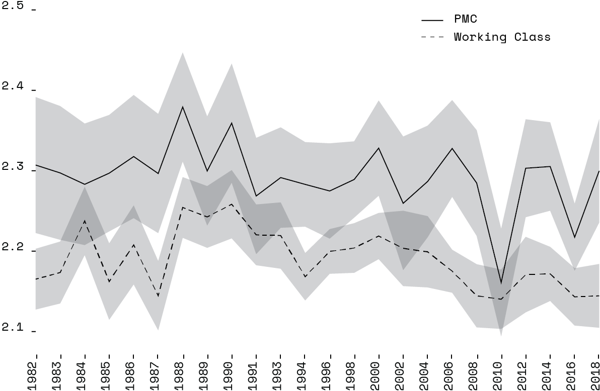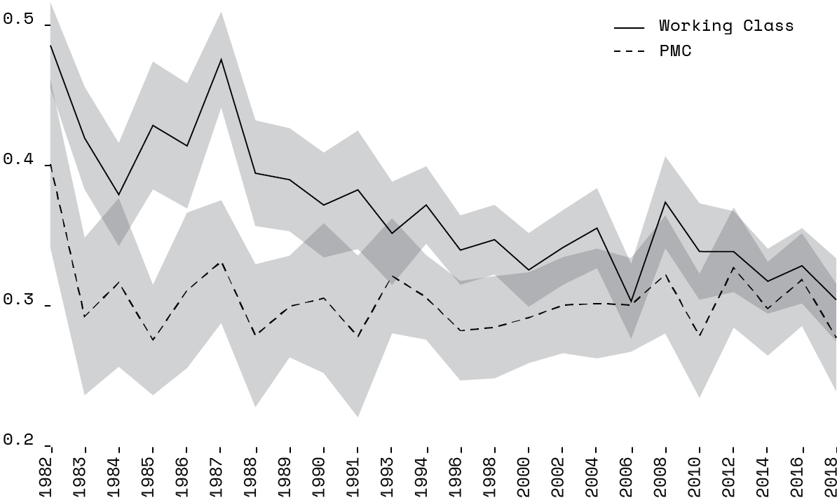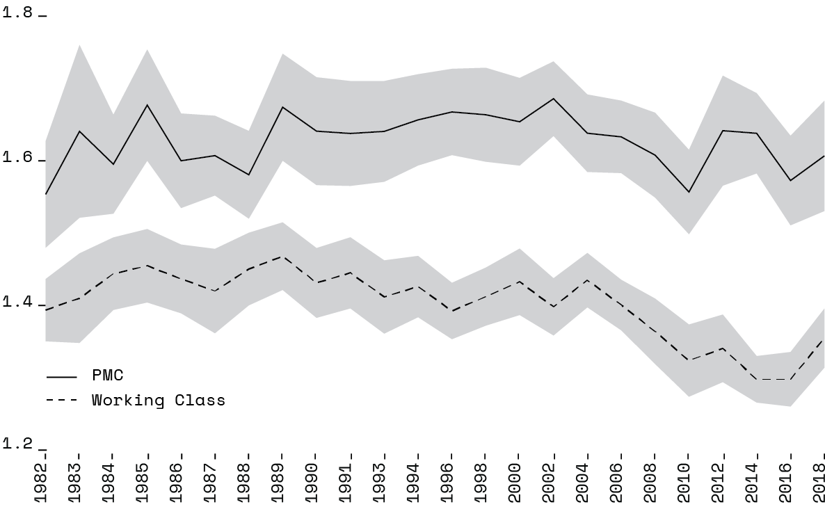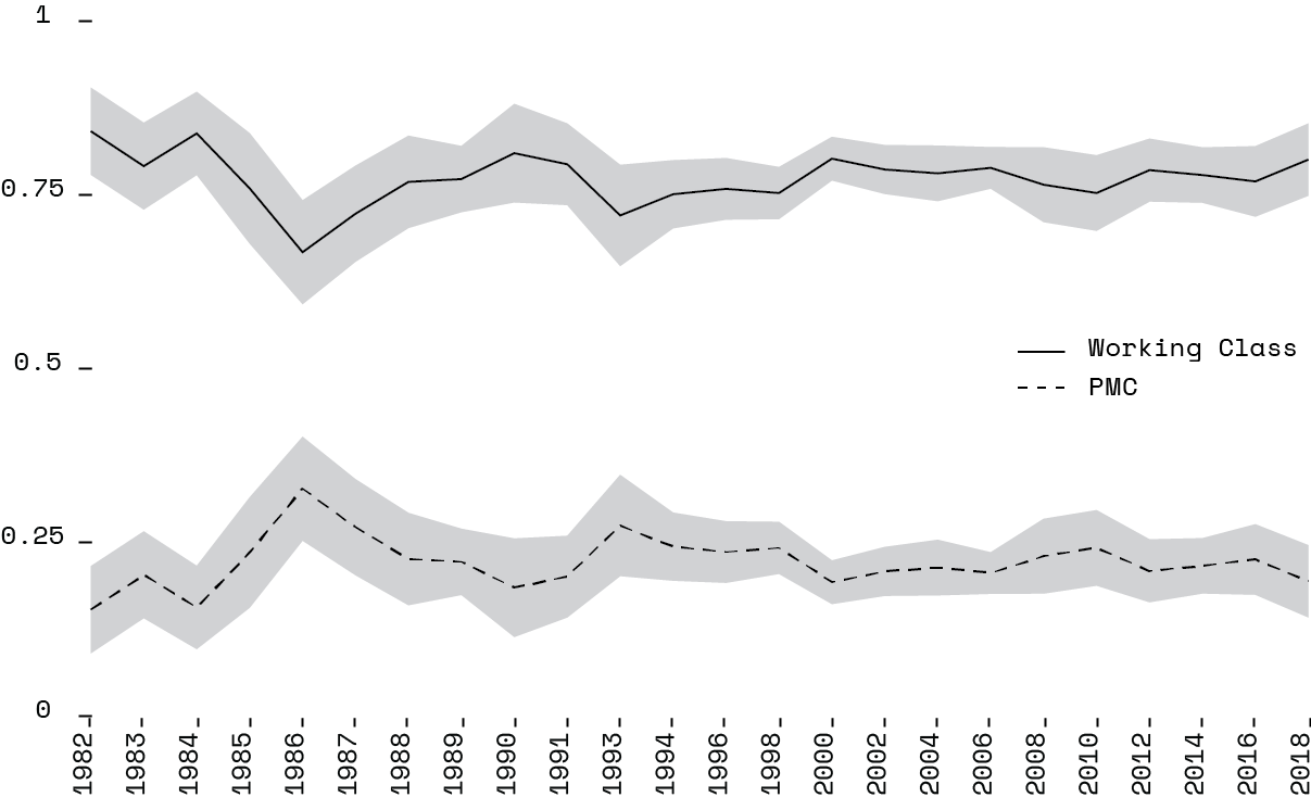 Average Working-Class and PMC Subjective Assessment of Class Position, 1982–2018