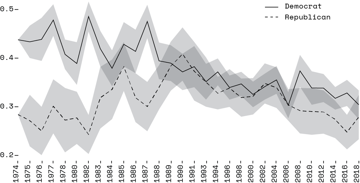 Note: GSS, author’s calculation. Self-reported party affiliation. Respondents could choose among “strong Democrat,” “not strong Democrat,” “independent, near Democratic party,” “independent,” “independent, near Republican party,” “not strong Republican,” “strong Republican,” or “other party.” For Figure 7, we constructed a binary variable where 1 = “strong Democrat,” “not strong Democrat,” or “independent, near “Democratic Party,” and 0 = all other responses.