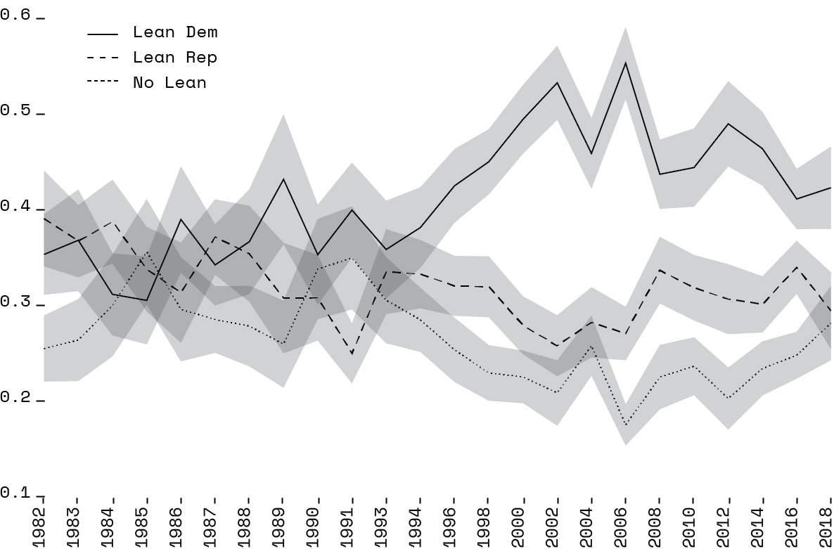 Note: GSS, authors’ calculation. Self-reported racial identification. Respondents could choose between “strong Democrat,” “not strong Democrat,” “independent, near Democratic Party,” “independent,” “independent, near Republican Party,” “not strong Republican,” “strong Republican,” or “other party.” For Figure 11, we constructed a binary variable for each series where “near Republican Party = “Lean Rep,” “near Democratic Party” = “Lean Dem,” and “independent = “no lean.”