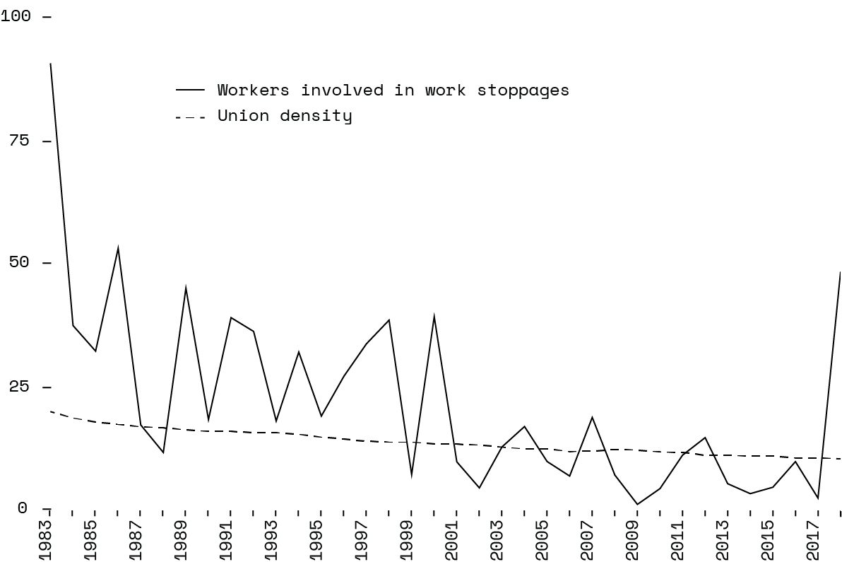 Note: Authors’ calculation. Data from the Bureau of Labor Statistics. Work stoppage figures are counted in tens of thousands, union density by percent.