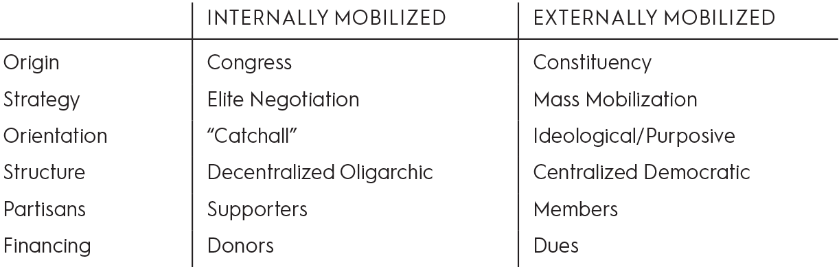 The innovative techniques employed by mass parties had far-reaching consequences. Figure 1 compares the differences between internally mobilized parties — those founded within the halls of power and by elite political insiders — and mass, externally mobilized parties. First, the advent of membership-driven financing ensured the party was primarily beholden to its members and not to a donor class. Second, the institutionalization of a party program helped not only to attract voters but inspired members to see beyond the short-term electoral failures of any given politician. A coherent ideological vision helped ensure partisans’ commitment to the party, and the program allowed members to judge how faithful their candidates had been to the party’s goals. This, in turn, facilitated party leaders’ responsiveness and accountability to rank-and-file membership.