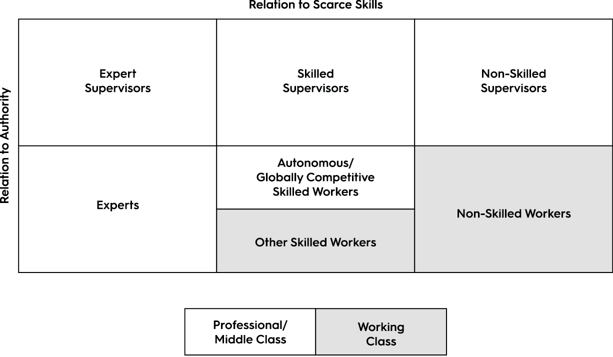We adopt Wright’s typology with one important exception: we view skilled workers who (a) work under conditions of relative independence, and/or (b) work in industries that are highly valued in the global economy, as members of the PMC. We argue that these workers are more likely than not to benefit, or at least not suffer, from the contemporary global economy. Skilled workers conducting their work under conditions of relative autonomy (such as business consultants and computer programmers) may feel more worried about job security or the threat of their jobs being outsourced or automated than in the past, but in general they have not experienced significant declines in living standards or work conditions over the last several decades. In turn, skilled workers in industries that are highly valued in the global economy may feel a sense of greater job insecurity or increased pressure to perform than in previous decades, but this is offset substantially by the knowledge that unemployment is low in their sector (which makes finding a new, well-paying job relatively easy).
